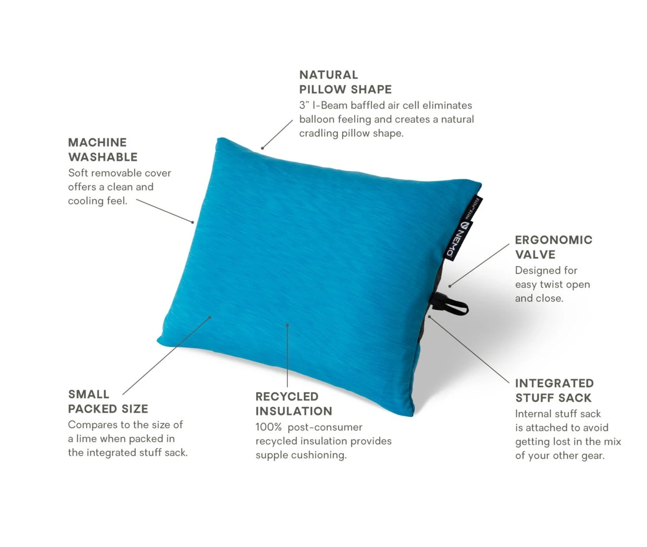 Sa housse de rangement est directement intégrée dans le coussin, ce qui permet un gain de place, de poids et facilite son utilisation. La valve de gonflage est ergonomique pour gonfler plus facilement l’oreiller.