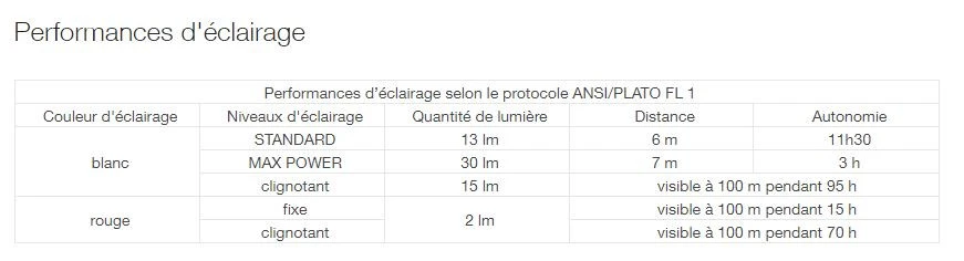 La e+Lite de Petzl est une lampe frontale de secours ultra- compacte et ultra-légère de 26 grammes. Alimentée par deux piles plates, elle peut être conservée 10 ans dans votre trousse d’urgence, de secours… Elle délivre une puissance de 30 lumens avec une autonomie de 3 heures. Elle dispose d’une lumière blanche, d’une lumière rouge et d’un mode fixe ou clignotant. Son mode clignotant permet d’être visible à 100 mètres pendant 95 heures.