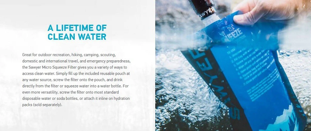 Le Micro Squeeze de Sawyer est un filtre à eau comprenant un filtre, une paille, une seringue de nettoyage et une bouteille d’eau pliable d’une capacité d’1 litre. Ce filtre a eau avec membrane bénéficie d’une filtration rapide pour un usage immédiat. La poche à eau permet aussi le stockage d’une petite quantité d’eau. Le Micro Squeeze peut-être facilement vissé sur une bouteille d’eau conventionnelle ce qui le rend très polyvalent.