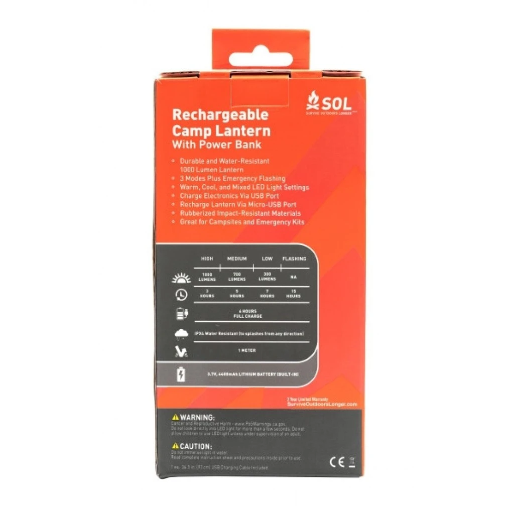 La Rechargeable Camp Lantern with Power Bank de SOL est une lanterne rechargeable à utiliser au bivouac, en survie ou au camping. Résistante à l’eau et aux chocs, elle a une puissance maximale de 1000 lumens. Elle dispose de 4 modes :