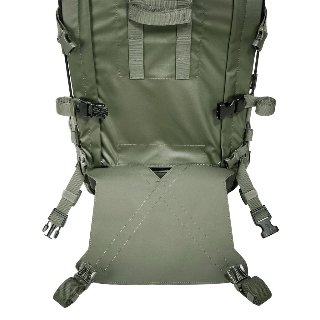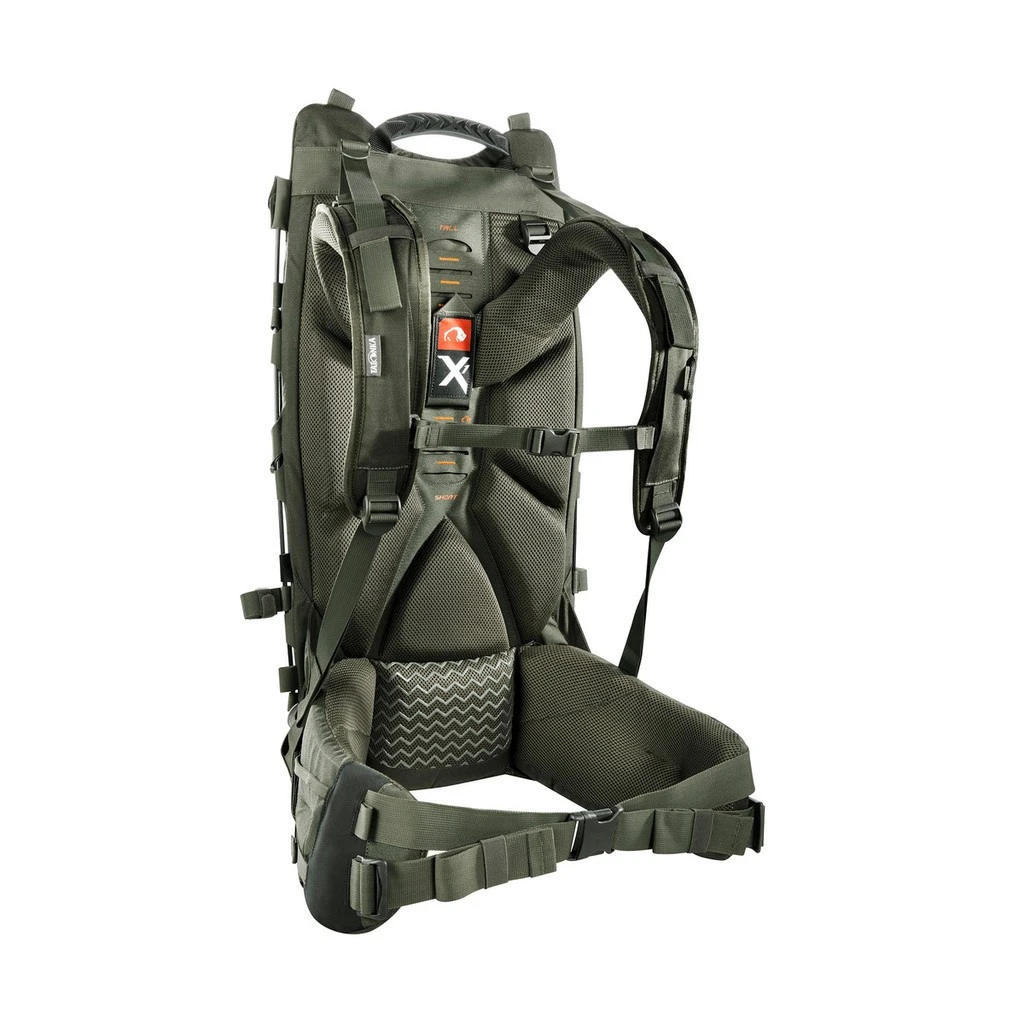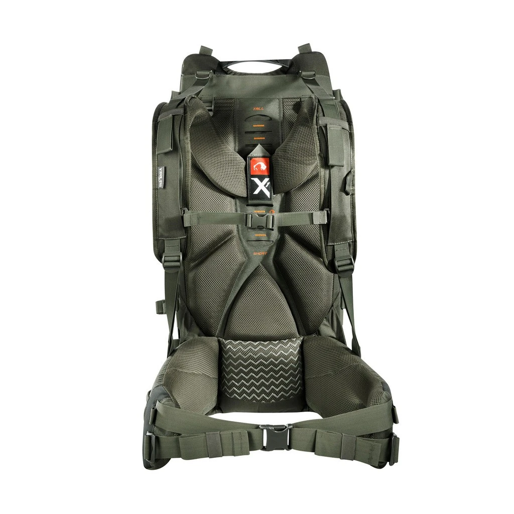 Le dos est rembourré de manière ergonomique et il est réglable pour s’adapter à tous les gabarits. La ventilation s’effectue grâce à la disposition des cousins de mousse. Les bretelles sont bien renforcées pour garder du confort même avec de lourdes charges sur le dos, et elles sont équipées d’un rappel de charge. La ceinture ventrale a une forme tridimensionnelle. Une poignée solide sur le dessus permet de déplacer le système une fois chargé.